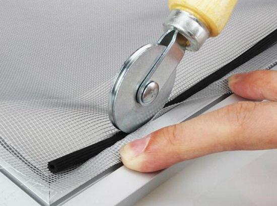 1、拆下旧纱。最好找宽敞的空地进行操作,避免窗纱上的灰尘污染家具,操作起来也不会意外碰撞到屋内设施。另外,如果原有压条弹性较好且没有明显老化,可以考虑继续使用。 2、安装压条。如下图所示,看上去比较简单,但一定要注意不要让压纱工具伤到内侧纱料,否则整块纱就废掉了。如果不熟练可以先用旧窗纱练练手,确保熟练之后再装新纱。