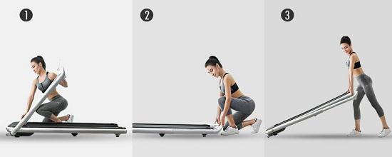 精灵Air的折叠方式与传统的跑步机不同:传统跑步机仅可将跑板扶起,从而节省地面空间;精灵Air的折叠方式是直接将立柱放倒、拉长,然后卡到跑板边缘,形成一个薄而规则的立方体,折叠后的厚度只有16cm左右,可以将其立在墙角或者推到床下。