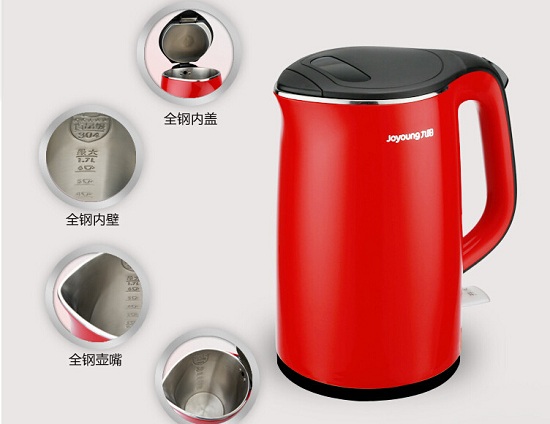 1.主要参数。容量1.7升,功率1800W,毛重1.34千克,采用食品级304不锈钢材质,内胆采用无缝工艺,不锈钢壶盖。 2.优点。九阳JYK-17S08电热水壶各方面的功能都称得上够用且好用,材质方面也尽可放心,价格只有不到100元,性价比极高。 3.不足之处。单层内胆,保温性差,可能会烫手,家中有老人和小孩的话要多加留意。炫彩贴心之选 - 九阳JYK-17F05A电热水壶